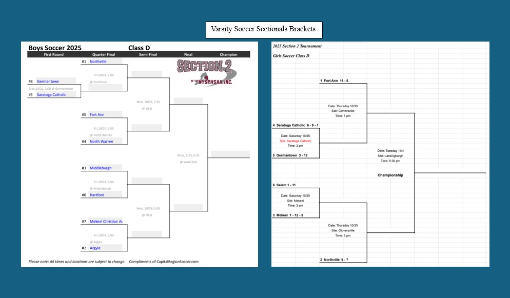 7:00 pm-9:00 pmCongratulations to the Boys' Varsity Soccer team on receiving the #1 seed in the Section 2 Class D Tournament! They received a first-round bye and will play a home quarterfinal game against the winner of the first-round game between Germantown and Saratoga Catholic on Friday. Oct. 24 at 7:00 p.m.