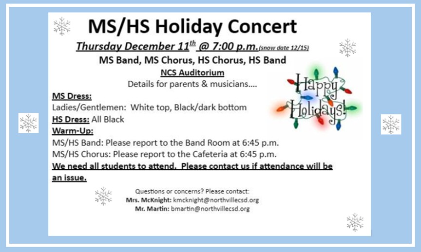 MS/HS Holiday Concert - Auditorium Northville Central School District, 131 S 3rd St, Northville, NY 12134, USA