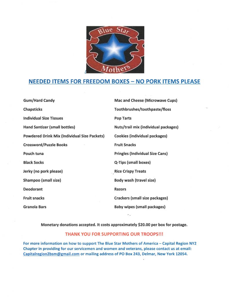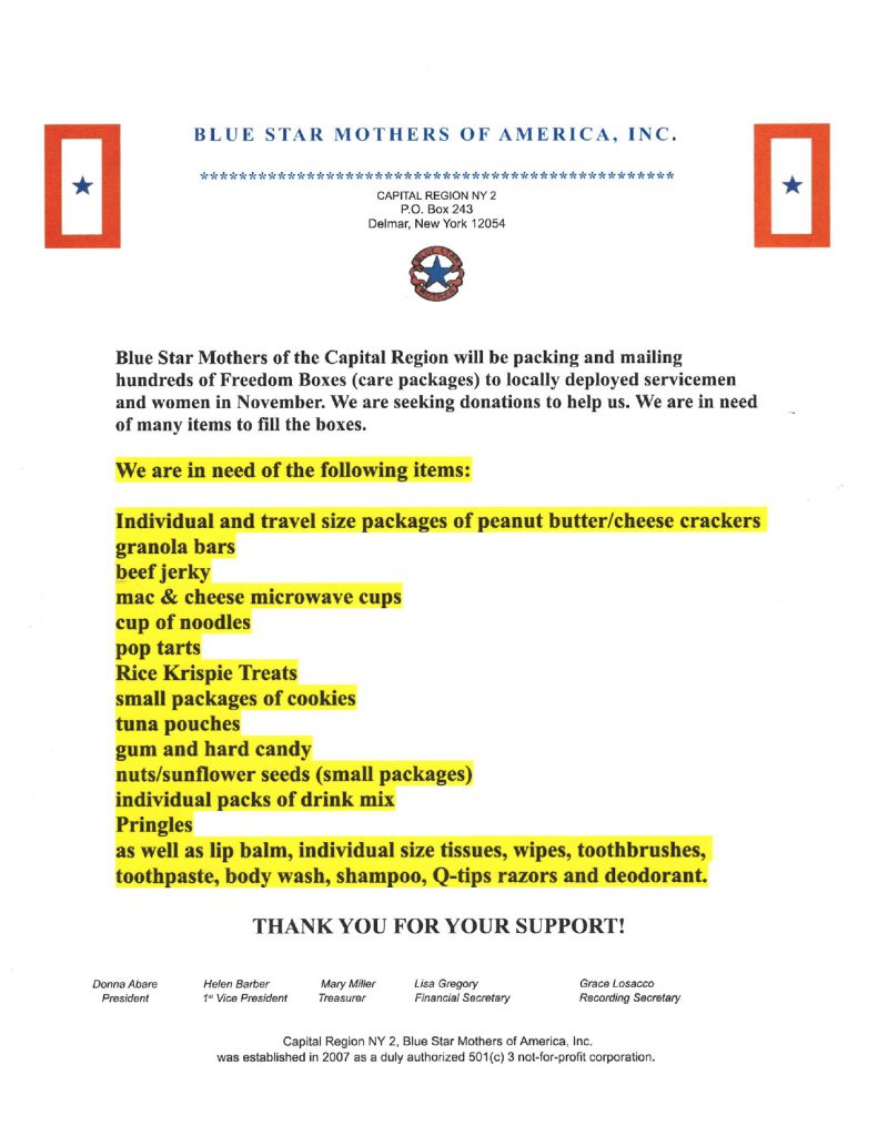 NCS is collecting items for a Blue Star Mothers of the Capital Region donation drive through the month of October!