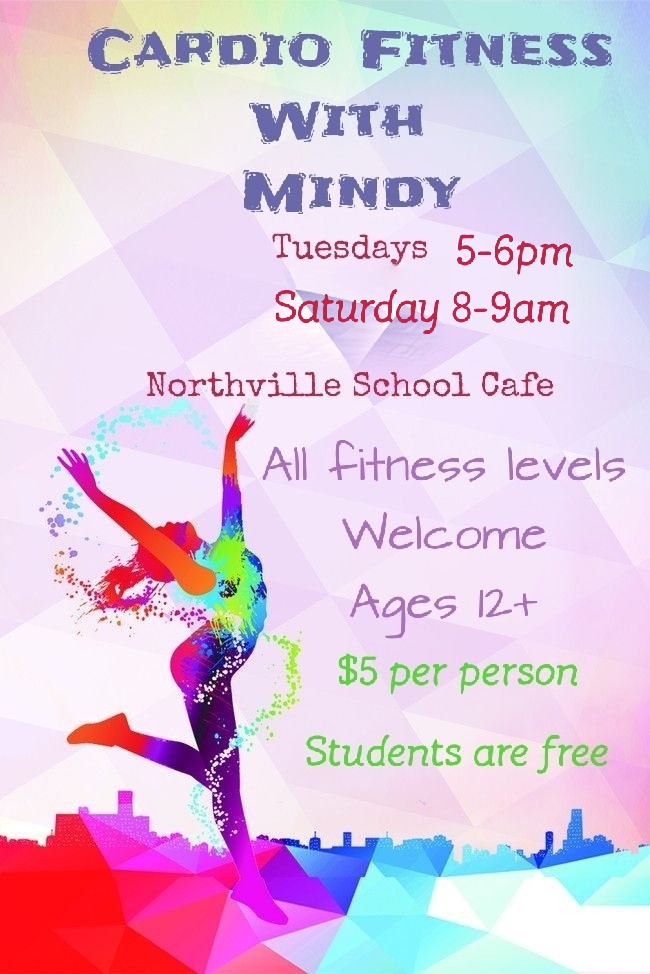 Cardio Fitness with Mindy (for ages 12 and up) will be available every Tuesday from 5:00-6:00 p.m. AND every Saturday from 8:00-9:00 a.m. in the NCS Cafeteria.