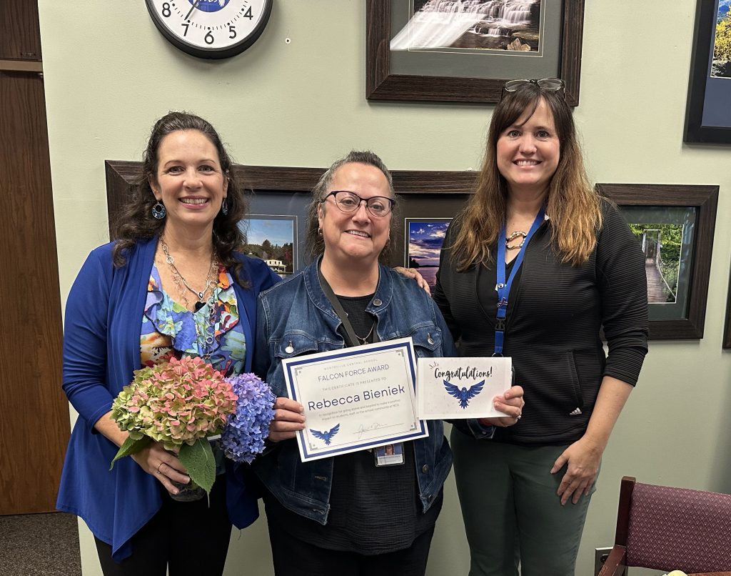 The Falcon Force Award celebrates an NCS staff member “who goes above and beyond to make a positive impact on students, staff or the school community”. This month’s winner is teaching assistant Becky Bieniek, who was nominated by multiple staff members for her tireless work with students of all ages in the library media center, as well as for her kind heart and ever-present smile. Congratulations, Ms. B. – we appreciate all you do!
