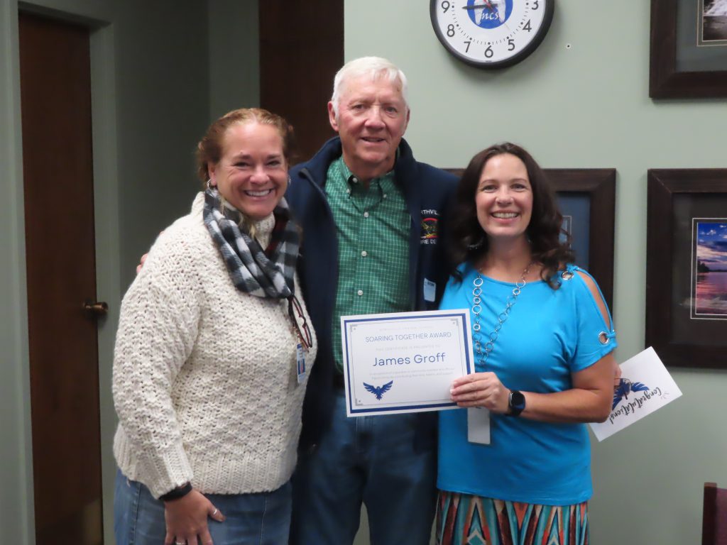 The Soaring Together Award honors a parent, guardian or community member, as nominated by an NCS employee, who helps “lift our Falcon family by contributing their time, talents and support”. This month, music teacher Kristy McKnight nominated community member Jim Groff for his help over the past several years in coordinating the many different emergency service organizations that participate in the annual Elementary Safety Day. During the award presentation, Ms. McKnight told Mr. Groff “I wanted you to know what a blessing it is, all you do is so monumental. The collaboration we have together is so beneficial for the students here. I still have kids in the Middle School and High School who still talk about (all) the Safety Days we put together, even from 10 years ago. It leaves a lasting impact. I wanted you to know how important you are to our school community, and to acknowledge and honor you.” Congratulations, and thank you, Mr. Groff!