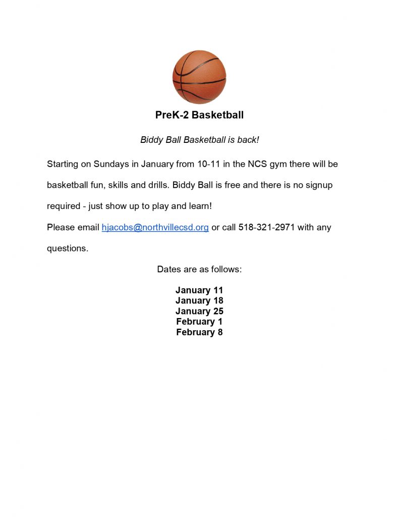 Biddy Ball Basketball for Grades PreK-2 begins Sunday, January 11, at 10:00 a.m. and continues each Sunday through February 8.