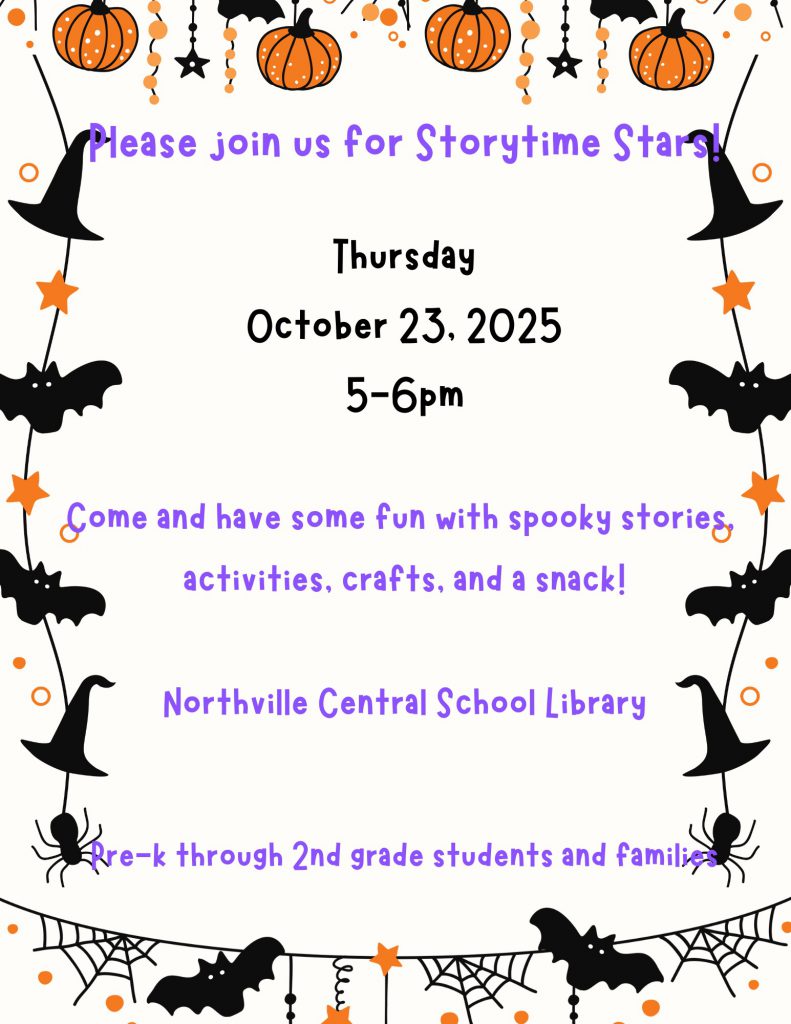 Posted on October 17, 2025October 17, 2025Storytime Stars Reading Night Oct. 23! All Pre-K through grade 2 students (and siblings!) are welcome! Share this: Click to share on Facebook (Opens in new window) Facebook Click to share on X (Opens in new window) X