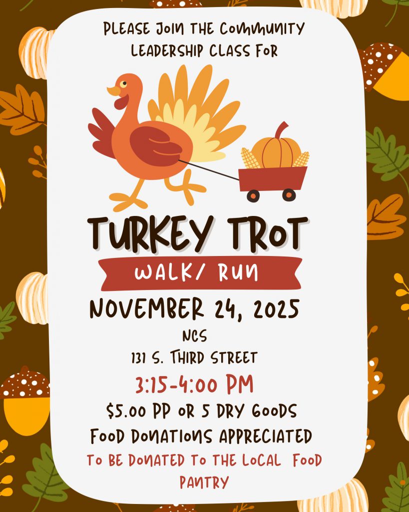 Please join the Community Leadership class for our first-ever Turkey Trot at 3:15 p.m. on Monday, November 24!