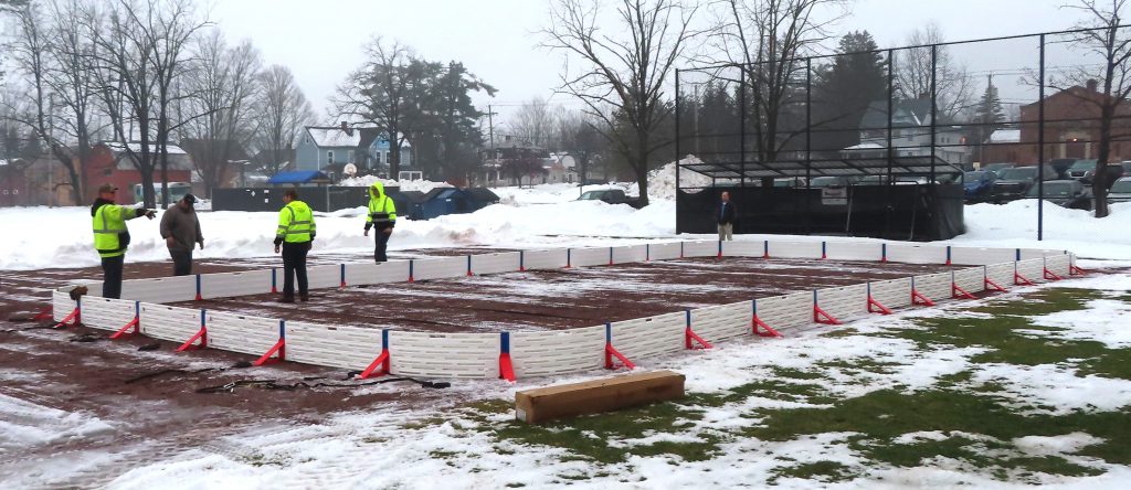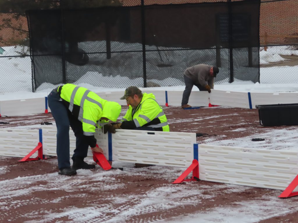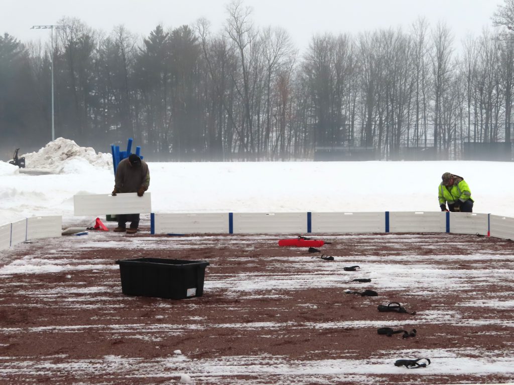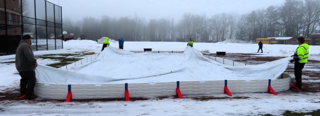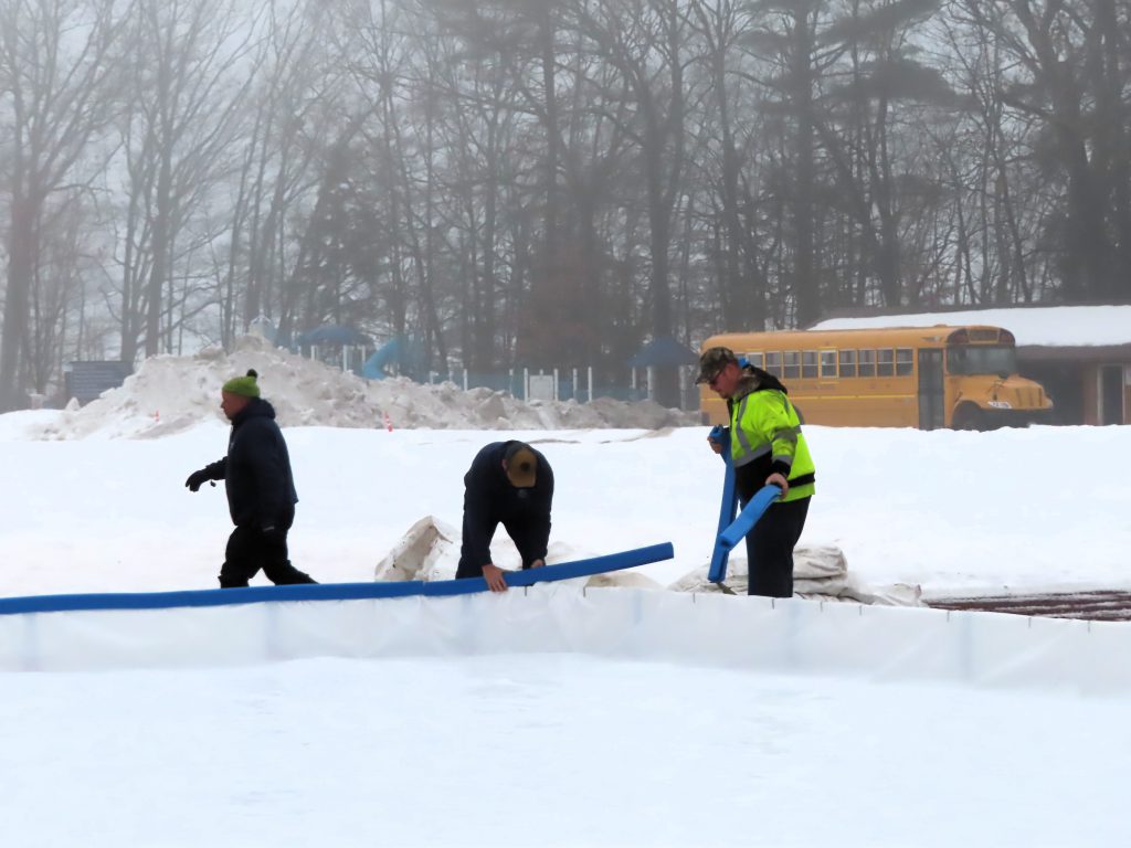 The Village Crew made quick work of the initial construction of the ice rink this morning! The forms were built, the liner was laid down and secured, the foam bumpers were added, and the rink was flooded in just under two hours. Great job, everyone!