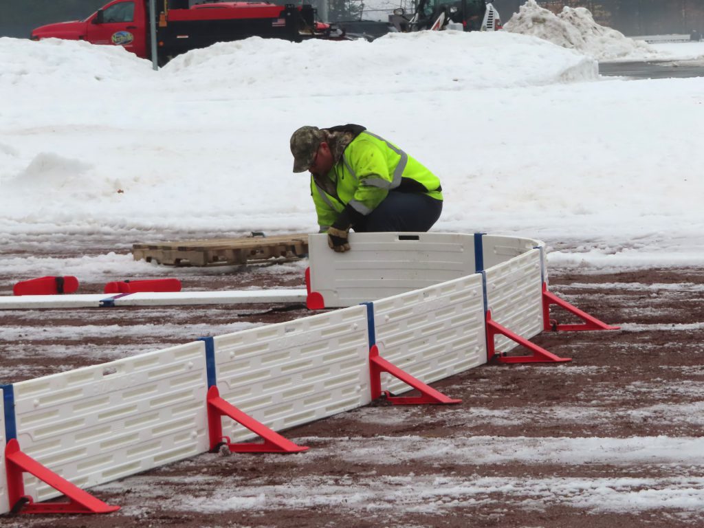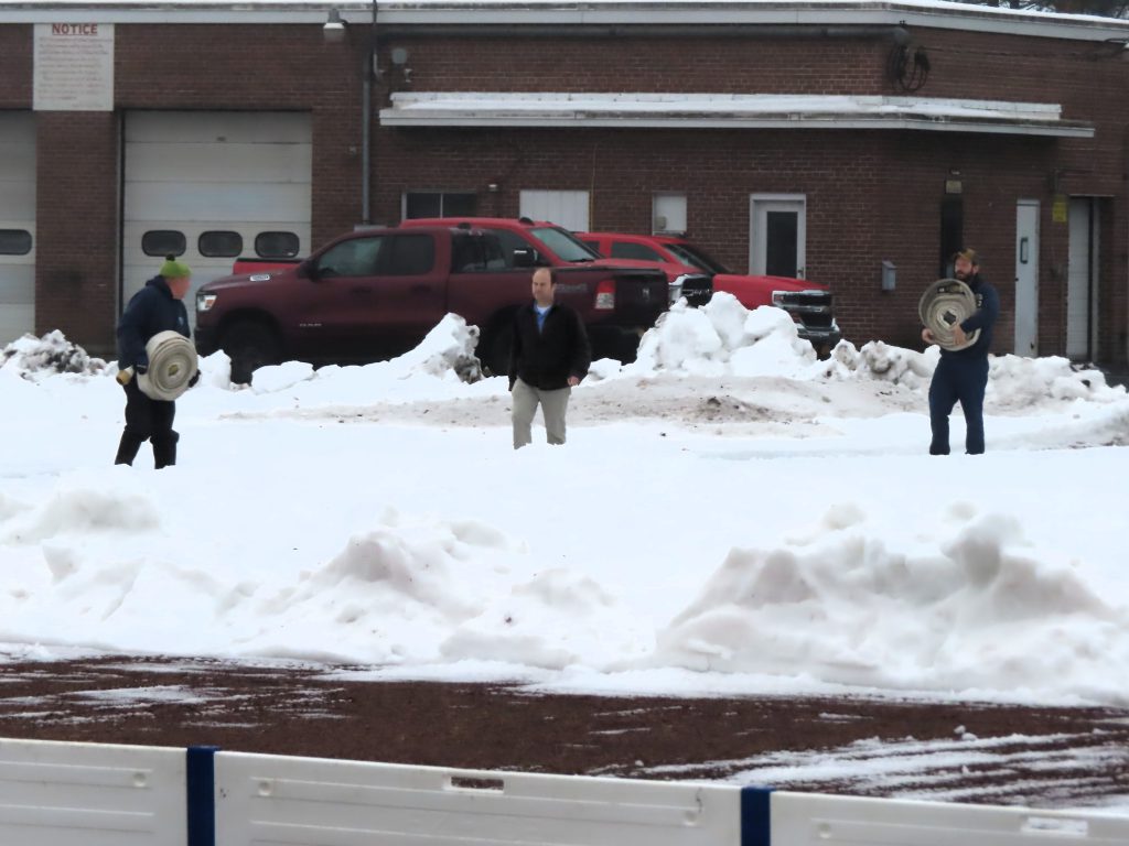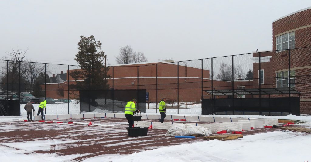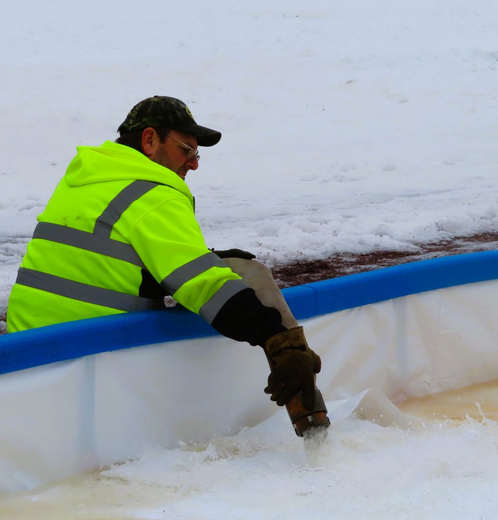 The Village Crew made quick work of the initial construction of the ice rink this morning! The forms were built, the liner was laid down and secured, the foam bumpers were added, and the rink was flooded in just under two hours. Great job, everyone!